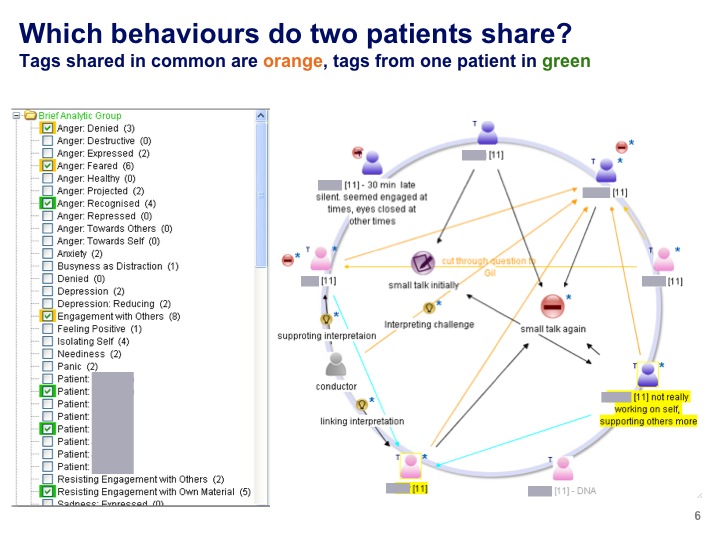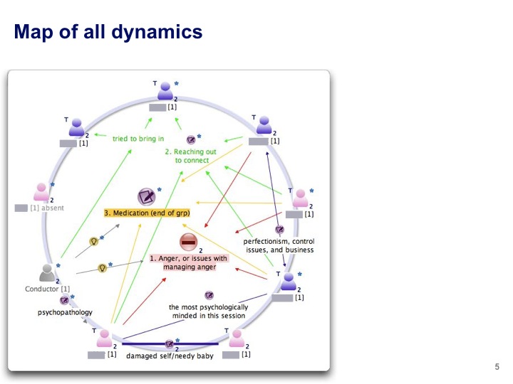 In recent work with psychotherapists, we’ve been using Compendium to convert their usual notes from analytic group sessions, into maps that reflect key aspects of the group dynamics.