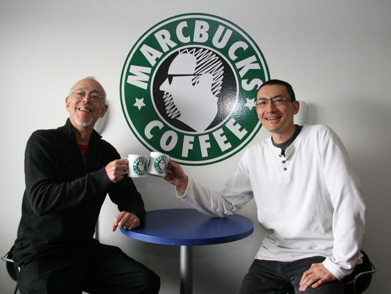 Emeritus Professor Marc Eisenstadt and Professor of Learning Informatics Simon Buckingham Shum joined together to 'clink coffee mugs' at the opening...