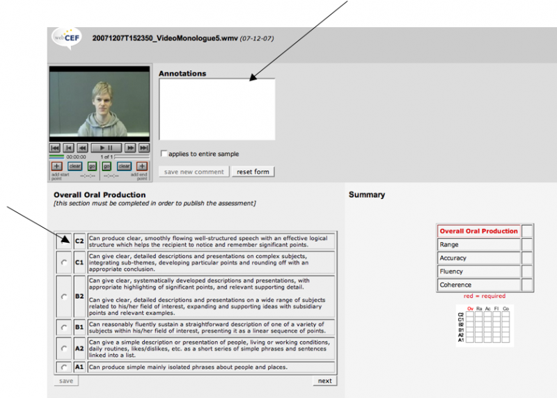 webCEF provided a web-based assessment tool that allowed students and teachers to grade spoken language samples against the Common European Framework scales, originally an initiative of the Council of Europe. Running on a KMi server, and authored by Kevin Quick and Chris Valentine, webCEF built on our experience with the Macromedia Flash Communication Server to allow students to record their samples directly into the website (FlashVlog) as well as uploading pre-recorded media.
